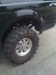 Rears went on with no problems as I suspected, but boy was I ever happy with the looks. While I dont off road much (Yet) I wanted that look. They are noisy as all hell on the road +40 MPH however the big diesel seems to manage them well and the sound makes me feel like I am driving a prop plane.