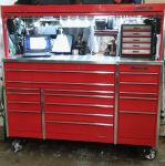That ^ is the old box. The new one is about 7 inches deeper so I was able to combine 2 drawers in to 1 in a lot of cases. Also the old one had some cheap side cabinets (harbor freight on the right and Waterloo locker on the left) It was the right side cabinet that held mostly test parts. But since we are allegedly getting built in tool boxes within the next 2 years I hesitate to add much on to this box at the present time because it's going to have to fit in my home garage eventually. If I do add anything it would likely be the upper matching bulk storage cabinet. I am glad that I went with the candy apple red rather than the regular Snap-On Red though. My box makes the regular red look orange in comparison.