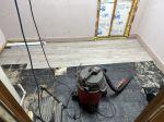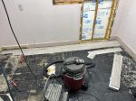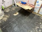 I decided that since I am only doing a small amount of drywall work that I would put down the floor to prevent the remaining black tar from becoming impregnated with dirt, drywall dust and whatever... The truth of the matter here is the same with anything that is not "new" constriction, and that is: WHERE DO YOU DRAW THE LINE? In this case I'm putting down the floor and I will cover the floor with all the old cardboard boxes that the new major appliances came in to prevent damage, plus they are pretty inexpensive compared to most all other options, in other words I still have a full box of tiles left over with scraps. Since I am only replacing one base trim (by the pipes) and the manifold will come in where the door used to be, drywall work will be minimal.